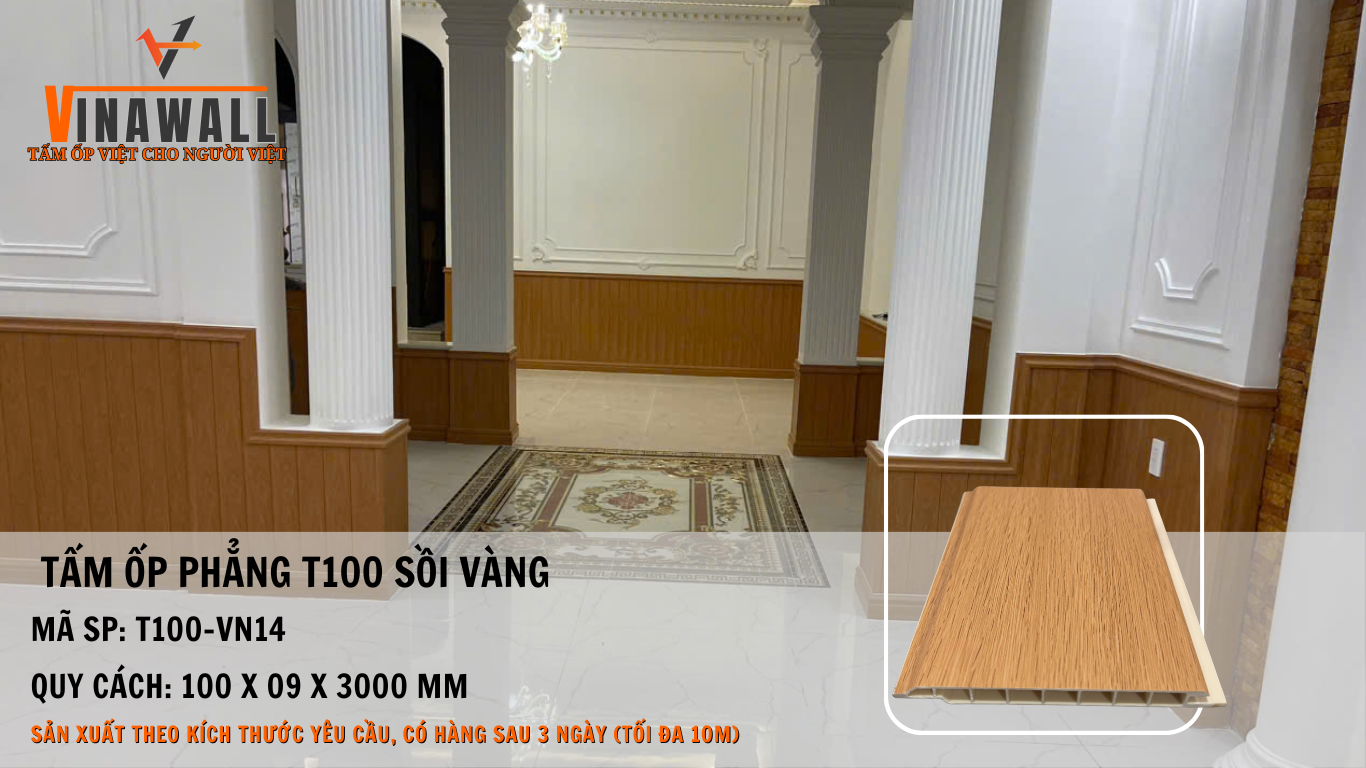 Tấm ốp phẳng T100 sồi vàng là giải pháp ốp lamri hoàn hảo, mang lại cảm giác ấm cúng – sạch sẽ – tinh tế cho tường nhà, hành lang, phòng khách
